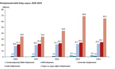 TÜİK, 2024 yılına ilişkin kütüphane istatistiklerini açıkladı. Buna göre; kütüphane sayısı 2024 yılında 1 Cumhurbaşkanlığı Millet Kütüphanesi, 1 Milli Kütüphane, 1301 halk kütüphanesi, 637 üniversite kütüphanesi...