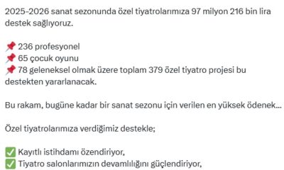Bakanlıktan yapılan açıklamaya göre; özel tiyatroların projelerine yapılacak yardımlar belli oldu. Bu kapsamda 2025-2026 sanat sezonu için ayrılan destek miktarı, bir önceki sezona göre yüzde 49,56...