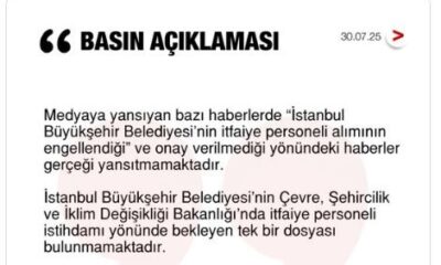 Bakanlığın sosyal medya hesabından yapılan açıklamada, “Medyaya yansıyan bazı haberlerde İstanbul Büyükşehir Belediyesinin itfaiye personeli alımının engellendiği ve onay verilmediği yönündeki haberler gerçeği yansıtmamaktadır. İstanbul Büyükşehir...
