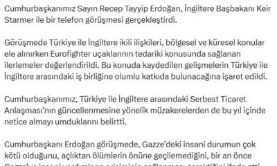 İletişim Başkanlığının sosyal medya hesabından yapılan açıklamada, “Cumhurbaşkanımız Sayın Recep Tayyip Erdoğan, İngiltere Başbakanı Keir Starmer ile bir telefon görüşmesi gerçekleştirdi. Görüşmede Türkiye ile İngiltere ikili...