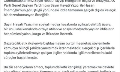 DMMnin sosyal medya hesabından yapılan açıklamada, “Cumhurbaşkanımız Sayın Recep Tayyip Erdoğanın bilgisi ve onayıyla, AK Parti Genel Başkan Yardımcısı Sayın Hayati Yazıcı ile Hasan İmamoğlunun görüştüğü...