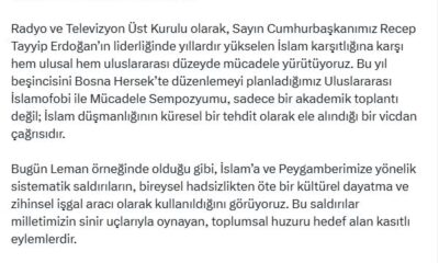 RTÜK Başkanı Ebubekir Şahin, sosyal medya hesabından yaptığı açıklamada, “Leman denilen dergi müsveddesinde yer alan, Peygamber Efendimiz Hz. Muhammede (s.a.v.) yönelik alçakça karikatür, sadece İslama değil,...