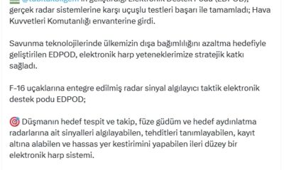 Bakan Mehmet Fatih Kacır, sosyal medya hesabından yaptığı açıklamada, “F-16 Elektronik Destek Podumuz Hava Kuvvetleri Komutanlığı envanterinde. TÜBİTAK BİLGEMin geliştirdiği Elektronik Destek Podu, gerçek radar sistemlerine...
