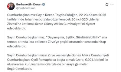 İletişim Başkanı Burhanettin Duran, sosyal medya hesabından yaptığı açıklamada, “Cumhurbaşkanımız Sayın Recep Tayyip Erdoğan, 22-23 Kasım 2025 tarihlerinde Johannesburgda düzenlenecek 20nci G20 Liderler Zirvesine katılmak üzere...