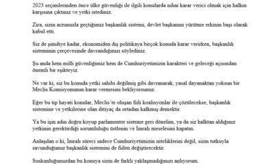 İYİ Parti Genel Başkanı Müsavat Dervişoğlu, mektubunda, “Sayın Cumhurbaşkanı; 2023 seçimlerinden önce ülke güvenliği ile ilgili konularda nihai karar verici olmak için halkın karşısına çıktınız ve...