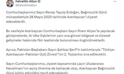 İletişim Başkanı Fahrettin Altun, ziyarete ilişkin sosyal medya hesabından açıklama yaptı. Altun, “Cumhurbaşkanımız Sayın Recep Tayyip Erdoğan, Bağımsızlık Günü münasebetiyle 28 Mayıs 2025 tarihinde Azerbaycanı ziyaret...