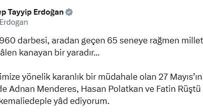 Cumhurbaşkanı Erdoğan, sosyal medya hesabından paylaştığı mesajda, “27 Mayıs 1960 darbesi, aradan geçen 65 seneye rağmen milletimizin kalbinde halen kanayan bir yaradır. Demokrasimize yönelik karanlık bir...