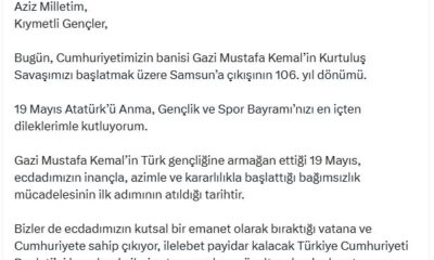 Cumhurbaşkanı Erdoğan, İletişim Başkanlığının sosyal medya hesabından paylaşılan mesajda, “Aziz milletim, kıymetli gençler; bugün Cumhuriyetimizin banisi Gazi Mustafa Kemalin Kurtuluş Savaşımızı başlatmak üzere Samsuna çıkışının 106ncı...