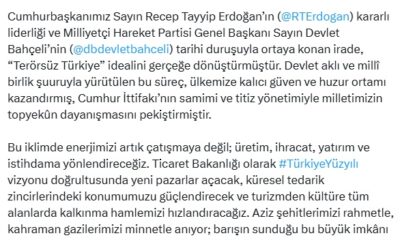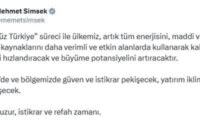 Bakan Şimşek, sosyal medya hesabı üzerinden yaptığı açıklamada, “Terörsüz Türkiye süreci ile ülkemiz, artık tüm enerjisini, maddi ve manevi kaynaklarını daha verimli ve etkin alanlarda kullanarak...