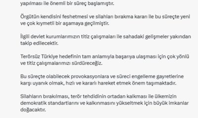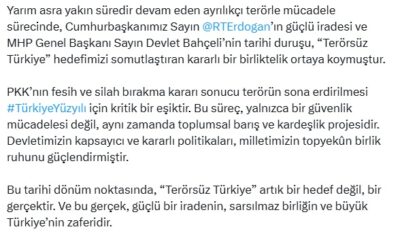 Cumhurbaşkanı Yardımcısı Cevdet Yılmaz, terör örgütü PKKnın fesih ve silah bırakma kararına ilişkin sosyal medya hesabından açıklamada bulundu. Yılmaz, Cumhurbaşkanı Recep Tayyip Erdoğan tarafından ortaya konulan...