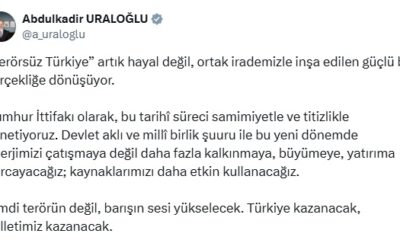 Bakan Uraloğlu, sosyal medya hesabından yaptığı açıklamada, “Terörsüz Türkiye artık hayal değil, ortak irademizle inşa edilen güçlü bir gerçekliğe dönüşüyor. Cumhur İttifakı olarak, bu tarihî süreci...