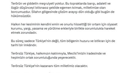 TBMM Başkanı Numan Kurtulmuş, sosyal medya hesabı üzerinden yaptığı açıklamada, “Milletimiz, terörden tamamen kurtulmak ve demokratik siyasetin zeminini güçlendirmek üzere yeni bir eşiğe gelmiştir. Bugün yapılan...