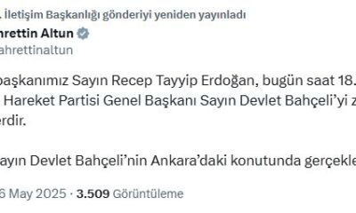 İletişim Başkanı Fahrettin Altun, sosyal medya hesabından yaptığı açıklamada, “Cumhurbaşkanımız Sayın Recep Tayyip Erdoğan, bugün saat 18.00de Milliyetçi Hareket Partisi Genel Başkanı Sayın Devlet Bahçeliyi ziyaret...