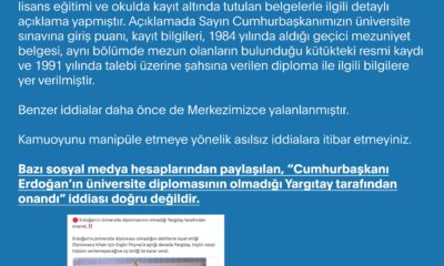 DMMnin sosyal medya hesabından yapılan açıklamada, “Bazı sosyal medya hesaplarından paylaşılan, Cumhurbaşkanı Erdoğanın üniversite diplomasının olmadığı, Yargıtay tarafından onandı iddiası doğru değildir. Yargıtay 4üncü Ceza Dairesinin...