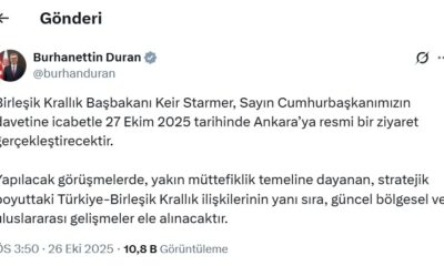 İletişim Başkanı Burhanettin Duran, sosyal medya hesabından yaptığı paylaşımda, “Birleşik Krallık Başbakanı Keir Starmer, Sayın Cumhurbaşkanımızın davetine icabetle 27 Ekim 2025 tarihinde Ankara’ya resmi bir ziyaret...