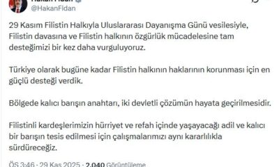 Dışişleri Bakanı Hakan Fidan, 29 Kasım Filistin Halkıyla Uluslararası Dayanışma Gününe ilişkin sosyal medya hesabından açıklama yaptı. Bakan Fidan, “29 Kasım Filistin Halkıyla Uluslararası Dayanışma Günü...