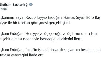 CUMHURBAŞKANI Recep Tayyip Erdoğan, Hamas Siyasi Büro Başkanı İsmail Heniyye ile telefonla görüşüp, başsağlığı dileklerini iletti.İletişim Başkanlığının sosyal medya hesabından görüşmeye ilişkin yapılan açıklamada, “Cumhurbaşkanımız Sayın Recep...