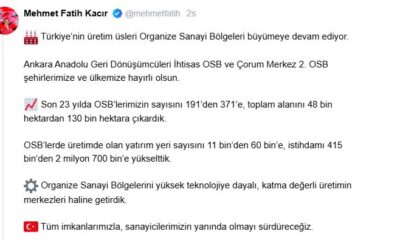 Bakan Kacır, NSosyal hesabından yaptığı paylaşımda, organize sanayi bölgelerinin büyümeye devam ettiğini belirterek, “Ankara Anadolu Geri Dönüşümcüleri İhtisas OSB ve Çorum Merkez 2nci OSB şehirlerimize ve...