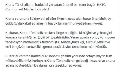 Cumhurbaşkanı Yardımcısı Cevdet Yılmaz, sosyal medya hesabından yaptığı açıklamada, “Kıbrıs Türk halkının iradesini yansıtan önemli bir adım bugün KKTC Cumhuriyet Meclis’inde atıldı. Kıbrıs sorununa iki devletli...