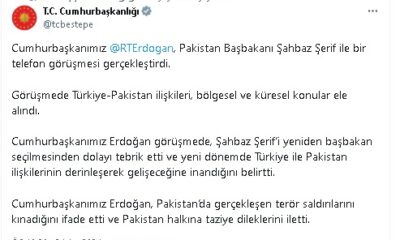 CUMHURBAŞKANI Recep Tayyip Erdoğan, Pakistan Başbakanı Şahbaz Şerif ile telefon görüşmesi gerçekleştirdi. Görüşmede Cumhurbaşkanı Erdoğan, Şahbaz Şerif’i yeniden Başbakan seçilmesinden dolayı tebrik etti.Cumhurbaşkanı Erdoğan, Pakistan Başbakanı...