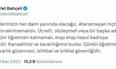 MHP Genel Başkanı Devlet Bahçeli, “Atanamayan hiçbir öğretmen bırakılmamalıdır. Ücretli, sözleşmeli veya bir başka ad ve tanım altında hiçbir öğretmen kalmamalı, etap etap hepsi kadroya geçirilmelidir”...