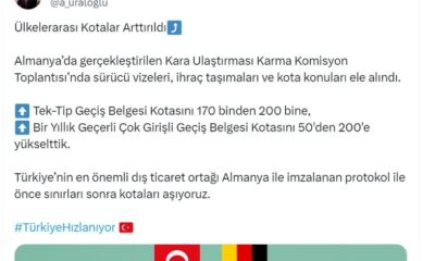 ULAŞTIRMA ve Altyapı Bakanı Abdulkadir Uraloğlu, Almanya ile imzalanan protokol ile tek-tip geçiş belgesi kotasını 170 binden 200 bine, bir yıllık geçerli çok girişli geçiş belgesi...