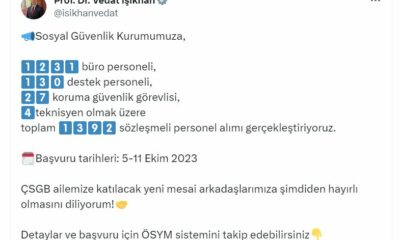 ÇALIŞMA ve Sosyal Güvenlik Bakanı Vedat Işıkhan, Sosyal Güvenlik Kurumu’na (SGK), 1392 sözleşmeli personel alınacağını duyurdu. Çalışma ve Sosyal Güvenlik Bakanı Vedat Işıkhan, sosyal medya hesabından...