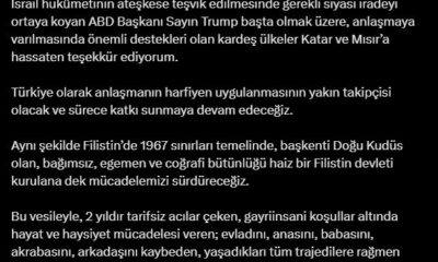 Cumhurbaşkanı Erdoğan, sosyal medya hesabından yaptığı paylaşımda, “Şarm El Şeyh’de yürütülen ve Türkiye olarak bizim de katkı sağladığımız Hamas-İsrail görüşmelerinin Gazze’de ateşkesle sonuçlanmasından büyük memnuniyet duyuyorum....