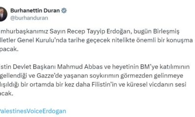 İletişim Başkanı Duran, sosyal medya hesabından yaptığı açıklamada, “Cumhurbaşkanımız Sayın Recep Tayyip Erdoğan, bugün Birleşmiş Milletler Genel Kurulu’nda tarihe geçecek nitelikte önemli bir konuşma yapacak. Filistin...