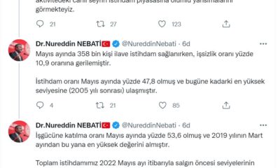 HAZİNE ve Maliye Bakanı Nureddin Nebati, “Türkiye Ekonomi Modeli kapsamında atılan adımların ve ekonomik aktivitedeki canlı seyrin istihdam piyasasına olumlu yansımalarını görmekteyiz. İstihdam oranı mayıs ayında...