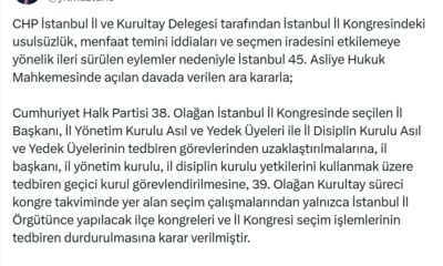 İstanbul 45’inci Asliye Hukuk Mahkemesi, CHP’nin 38’inci Olağan İstanbul İl Kongresinde seçilen İl Başkanı Özgür Çelik, yönetim ve disiplin kurulu üyelerinin tedbiren görevden uzaklaştırılmasına ve geçici...