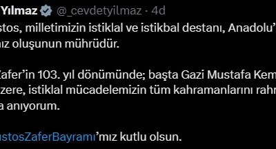 Cevdet Yılmaz, sosyal medya hesabından yaptığı paylaşımda, “30 Ağustos, milletimizin istiklal ve istikbal destanı, Anadolunun ebedi vatanımız oluşunun mührüdür. Büyük Zaferin 103üncü yıl dönümünde; başta Gazi...