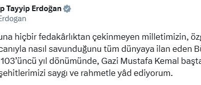 Cumhurbaşkanı Erdoğan, sosyal medya hesabından paylaştığı mesajda, “İstiklal uğruna hiçbir fedakarlıktan çekinmeyen milletimizin, özgürlüğünü kanıyla ve canıyla nasıl savunduğunu tüm dünyaya ilan eden Büyük Taarruzun 103üncü...