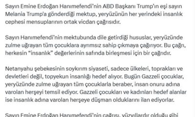 AK Partili Çelik, sosyal medya hesabından yaptığı açıklamada, “Sayın Emine Erdoğan Hanımefendinin ABD Başkanı Trumpın eşi Sayın Melania Trumpa gönderdiği mektup, yeryüzünün her yerindeki insanlık cephesi...