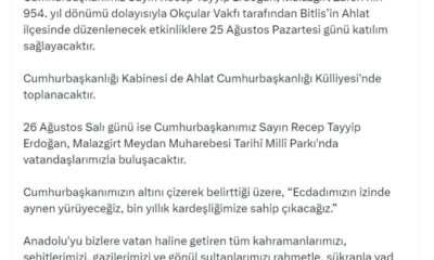 İletişim Başkanı Burhanettin Duran, sosyal medya hesabından yaptığı paylaşımda, “Cumhurbaşkanımız Sayın Recep Tayyip Erdoğan, Malazgirt Zaferi’nin 954üncü yıl dönümü dolayısıyla Okçular Vakfı tarafından Bitlis’in Ahlat ilçesinde...