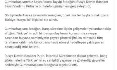 İletişim Başkanlığından yapılan açıklamaya göre; görüşmede, Alaska zirvesinin sonuçları, ticari ilişkiler başta olmak üzere Türkiye-Rusya ikili ilişkileri ele alındı. Cumhurbaşkanı Erdoğan, barış sürecine ilişkin gelişmeleri yakından...