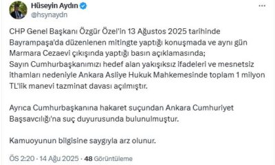 Cumhurbaşkanı Recep Tayyip Erdoğanın avukatı Hüseyin Aydın, sosyal medya hesabından yaptığı açıklamada, “CHP Genel Başkanı Özgür Özelin 13 Ağustos 2025 tarihinde Bayrampaşada düzenlenen mitingde yaptığı konuşmada...