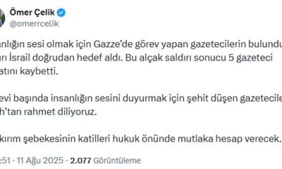 AK Partili Ömer Çelik, sosyal medya hesabından yaptığı açıklamada, “İnsanlığın sesi olmak için Gazzede görev yapan gazetecilerin bulunduğu çadırı İsrail doğrudan hedef aldı. Bu alçak saldırı...