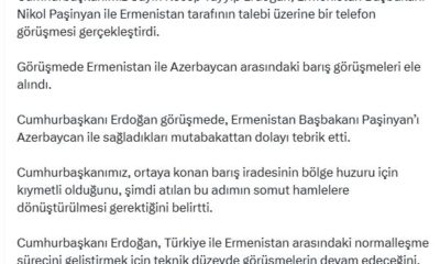 İletişim Başkanlığından yapılan yazılı açıklamada, “Cumhurbaşkanımız Sayın Recep Tayyip Erdoğan, Ermenistan Başbakanı Nikol Paşinyan ile Ermenistan tarafının talebi üzerine bir telefon görüşmesi gerçekleştirdi. Görüşmede Ermenistan ile...