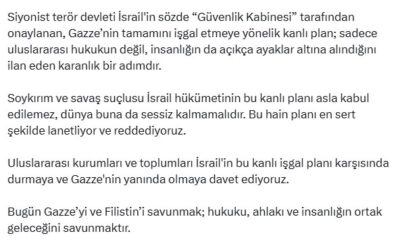 Bakanlıktan yapılan yazılı açıklamada, “İsrailin bölgedeki yayılmacı ve soykırımcı politikasının yeni bir aşamasını teşkil eden, Gazzedeki askeri harekatını genişletme yönündeki kararını en güçlü biçimde kınıyoruz. Fundamentalist...