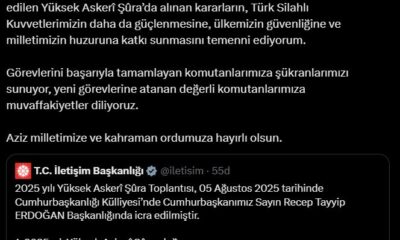 İletişim Başkanı Duran, sosyal medya hesabından yaptığı paylaşımda, “Cumhurbaşkanımız Sayın Recep Tayyip Erdoğan’ın başkanlığında icra edilen Yüksek Askeri Şurada alınan kararların, Türk Silahlı Kuvvetlerimizin daha da...