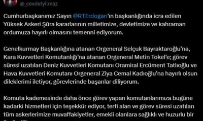 Cumhurbaşkanı Yardımcısı Yılmaz, sosyal medya hesabından yaptığı paylaşımda, “Cumhurbaşkanımız Sayın Recep Tayyip Erdoğanın başkanlığında icra edilen Yüksek Askeri Şura kararlarının milletimize, devletimize ve kahraman ordumuza hayırlı...