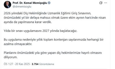 Sağlık Bakanı Kemal Memişoğlu, sosyal medya hesabından yaptığı açıklamada, “2026 yılındaki Diş Hekimliğinde Uzmanlık Eğitimi Giriş Sınavının, önümüzdeki yıl bir defaya mahsus olmak üzere ekim ayının...
