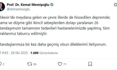 Bakan Memişoğlu, sosyal medya hesabından yaptığı açıklamada, “Balıkesirde meydana gelen ve çevre illerde de hissedilen depremde; atlama ve düşme gibi ikincil sebeplerden dolayı yaralanan 26 vatandaşımızın...