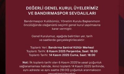 Bandırmaspor Kulübünden yapılan paylaşımda, “Bandırmaspor Kulübümüz, Yönetim Kurulu Başkanımızın öncülüğünde olağanüstü seçimli genel kurul yapılmasına karar vermiştir. Genel kurulumuz, 6 Kasım’da Bandırma Santral Kültür Merkezi’nde ilk...