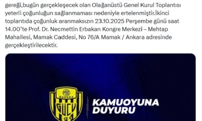 MKE Ankaragücü’nde bugün yapılması planlanan olağanüstü genel kurul toplantısı, yeterli çoğunluk sağlanamadığı gerekçesiyle ertelendi. Ertelemenin ardından başkent ekibinden yapılan yazılı açıklamada, “MKE Ankaragücü’nden olağanüstü genel kurul...