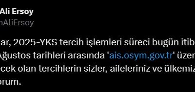 ÖSYM Başkanı Ersoy, sosyal medya hesabından yaptığı açıklamada, “Kıymetli adaylar, 2025-YKS tercih işlemleri süreci, bugün itibariyle başladı. 1-13 Ağustos tarihleri arasında ais.osym.gov.tr üzerinden gerçekleştirilecek olan tercihlerin...