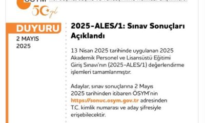ÖSYMden yapılan açıklamada, 13 Nisan 2025 tarihinde uygulanan 2025-ALES/1in değerlendirme işlemlerinin tamamlandığı belirtilerek, “Adaylar, sınav sonuçlarına 2 Mayıs 2025 tarihinden itibaren ÖSYMnin https://sonuc.osym.gov.tr adresinden T.C. kimlik...
