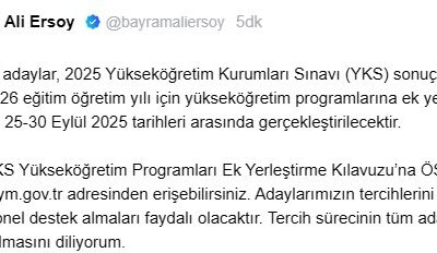 ÖSYM Başkanı Ersoy, NSosyal hesabından yaptığı açıklamada, “Kıymetli adaylar, 2025 Yükseköğretim Kurumları Sınavı (YKS) sonuçlarına göre, 2025-2026 eğitim öğretim yılı için yükseköğretim programlarına ek yerleştirme işlemleri...