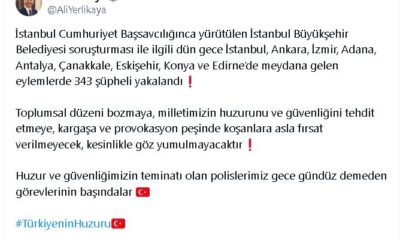 İçişleri Bakanı Ali Yerlikaya, sosyal medya hesabından yaptığı açıklamada, “İstanbul Cumhuriyet Başsavcılığınca yürütülen İstanbul Büyükşehir Belediyesi soruşturması ile ilgili dün gece İstanbul, Ankara, İzmir, Adana, Antalya,...